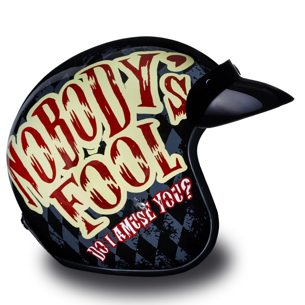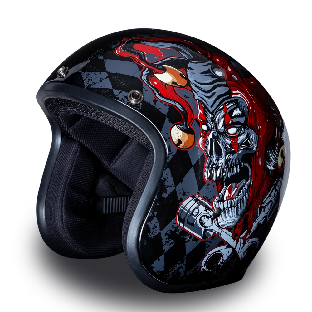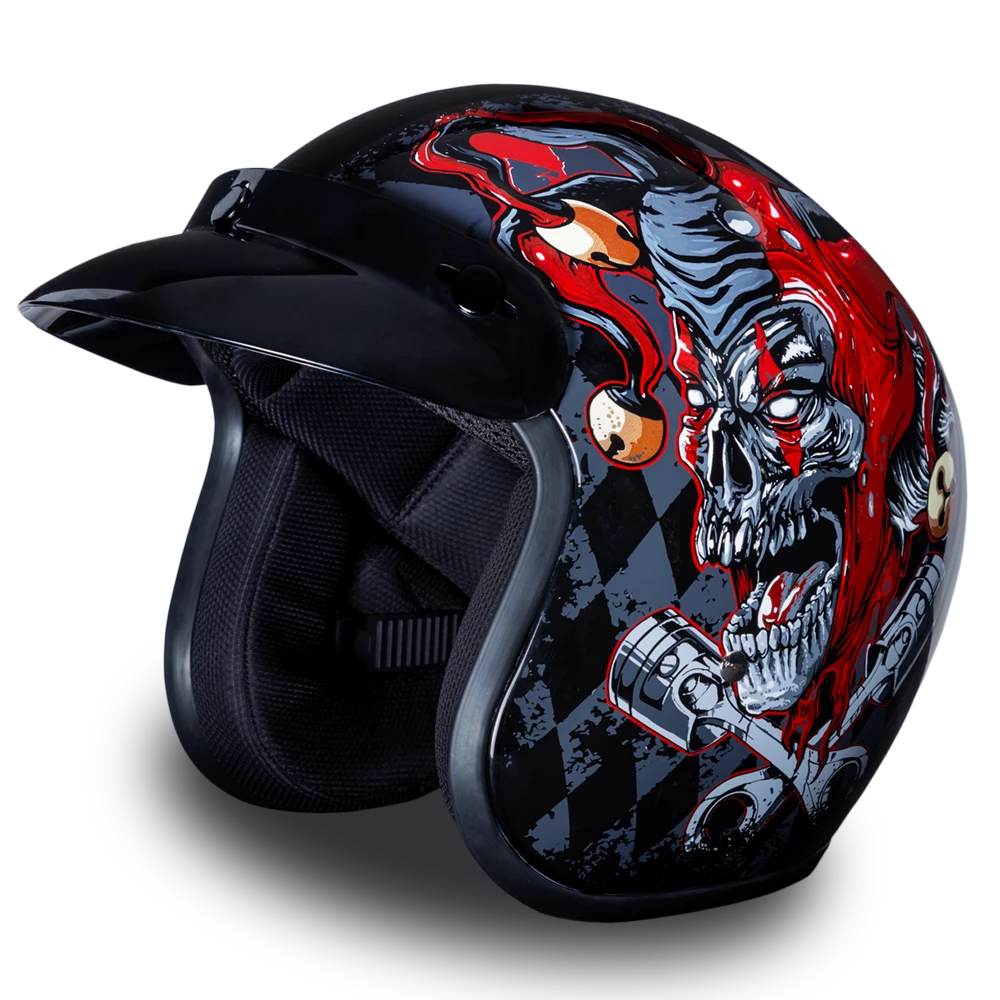 Our D.O.T. Daytona Cruiser 3/4 Shell Helmet In The Joker Graphic, Meets And Exceeds D.O.T. FMVSS 218 Standards And Is The Smallest D.O.T. 3/4 Shell Helmet Ever Made!!ย With 3 Different Shell Sizes, You’re Sure To Get That Proportionate Fit!!ย Available Only With Removable, Snap On Gloss Black Bubble Visor.ย Many More Colors And Designs Available Such As Soft Touch Dull Black, Hi-Gloss Black And White; Custom Colors: Gun Metal Grey Metallic; Specialty Items: Metal Flake.ย Free Head Wrap And Cloth Draw String Bag Included.ย Sizes Range From XS-2XL.