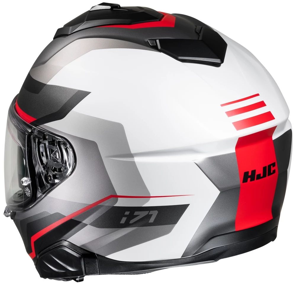 The i71 pushes the boundaries for a Sport-Touring model with its new sleek shell design. The Advanced Polycarbonate helmet now has 3 shells throughout the 6 available sizes to help optimize weight and comfort for the rider. The rearranged top vent with enlarged mouth vents allows increased air intake and ventilation. Also new with the i71 are both face shield and sun visor. The HJ-38 Pinlock ready face shield comes with a new PE (Push/Eject) locking system for improved safety, yet still easy to use with gloves. The new sun visor (HJ-V12) provides a new 3-position option for the rider to adjust the sun shield forward (up to 10mm) delivering ideal sun visor protection. The i71 will also accept the second-generation Smart HJC Bluetooth systems.